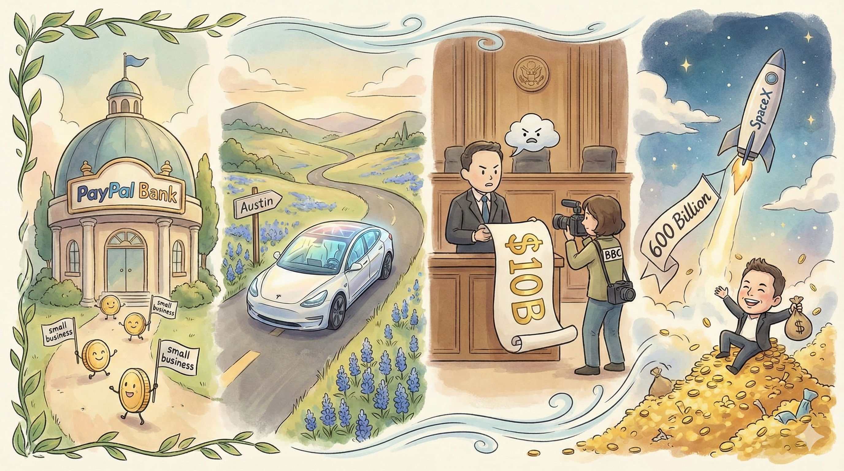 Here is your cheat sheet: PayPal is eyeing a banking charter, Tesla is testing driverless tech in Texas, and SpaceX just made Elon Musk wealthier than ever.